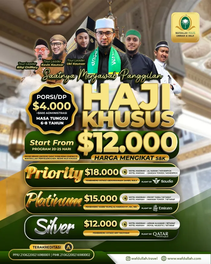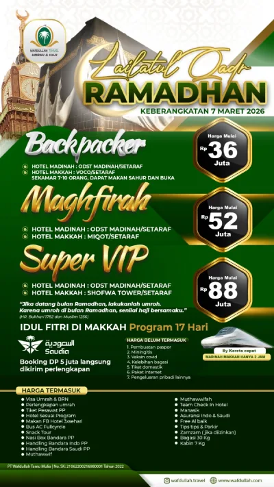 Wafdullah Travel adalah Travel Haji dan Umroh Sesuai tuntunan Al-Qur’an dan Sunnah dengan Ustadz pembimbing yang berkompeten dan fasilitas terbaik. Dapatkan penawaran biaya Haji dan Umroh yang terjangkau dan fasilitas yang akan memberikan kenyamanan beribadah.